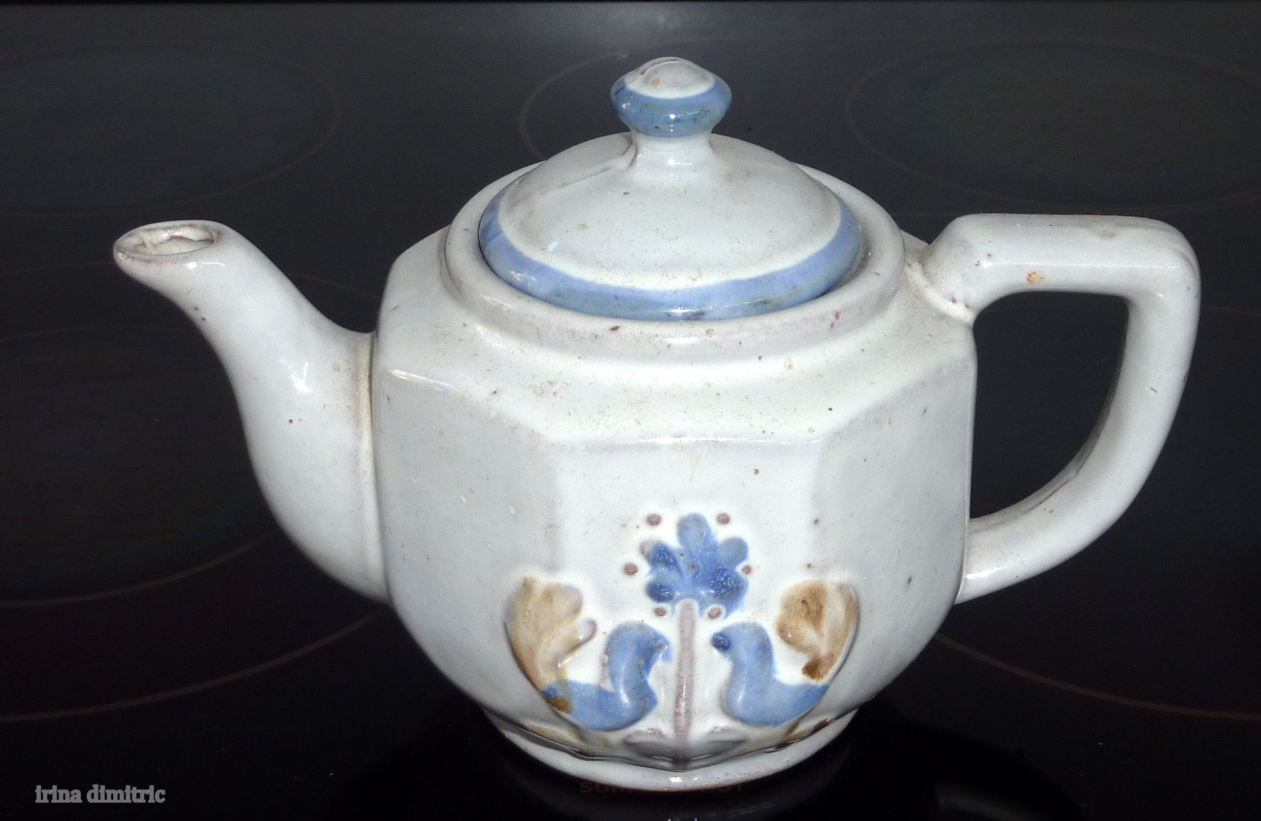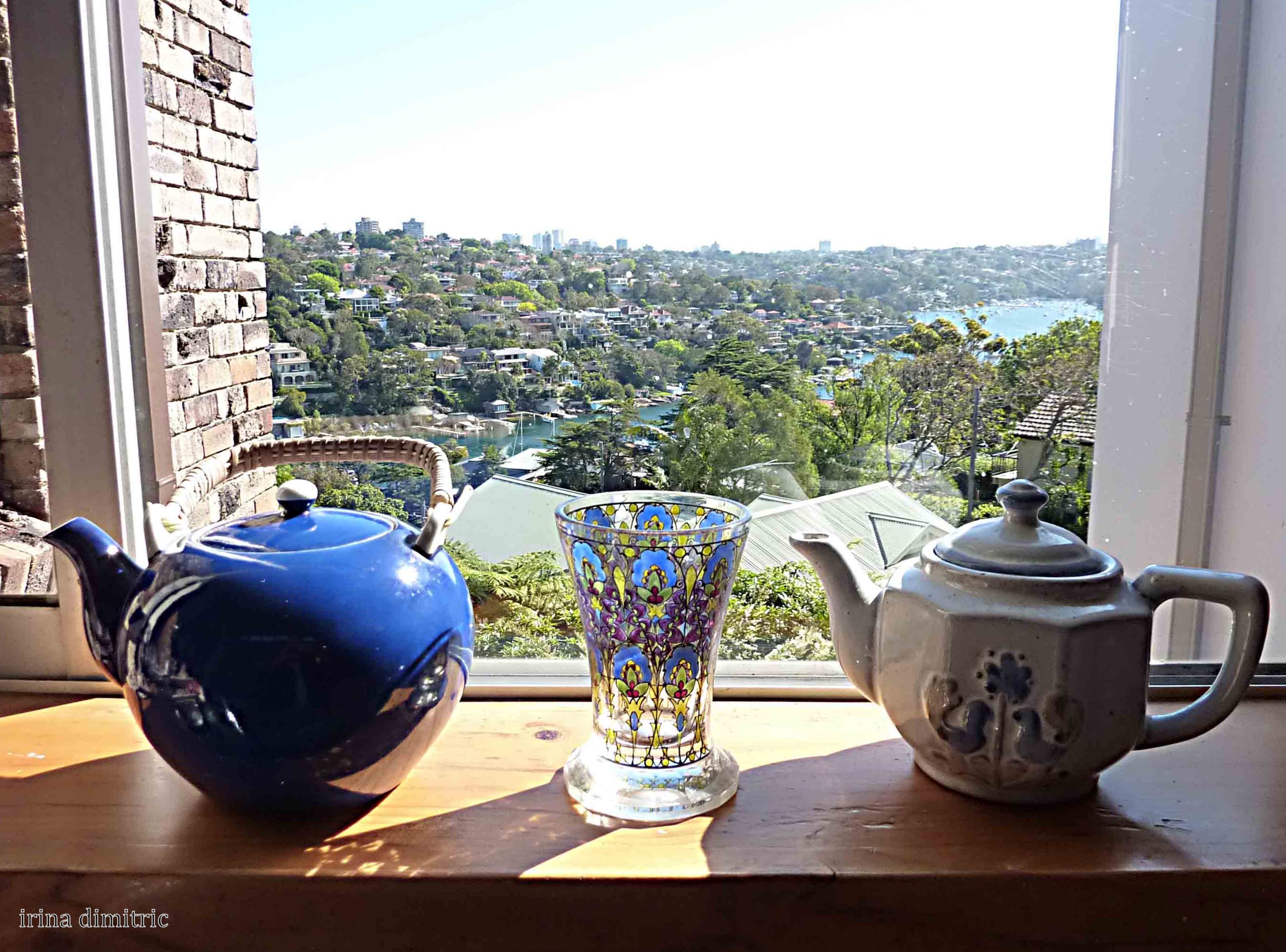 Painted vase between teapots on my kitchen windowsill