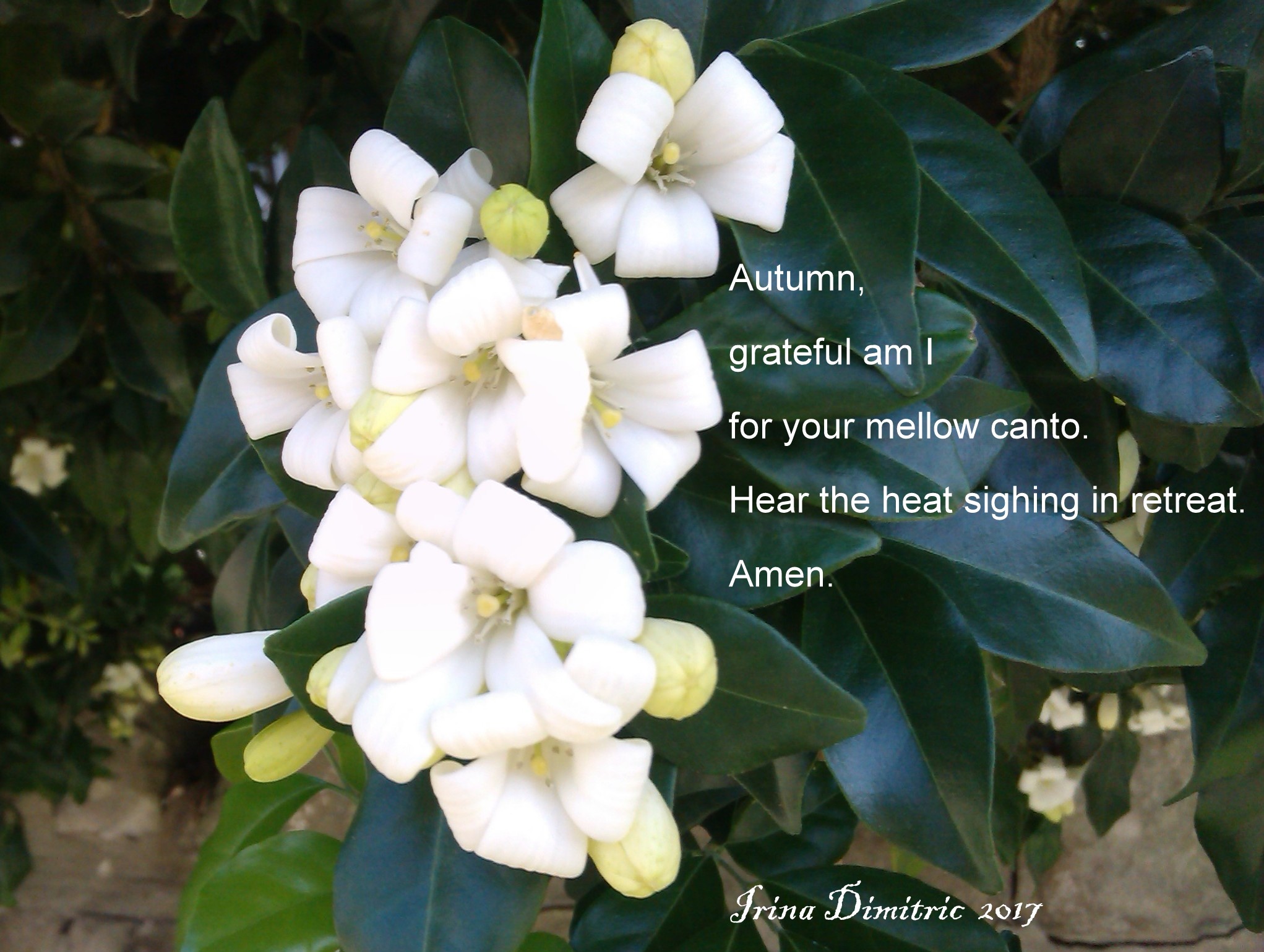 Lovely poem, Irina, and lovely orange blossom, too. I remember from last year how you couldn’t wait for the mellower days of autumn to arrive. We’re waiting for spring’s warmth to arrive over here. 🙂
