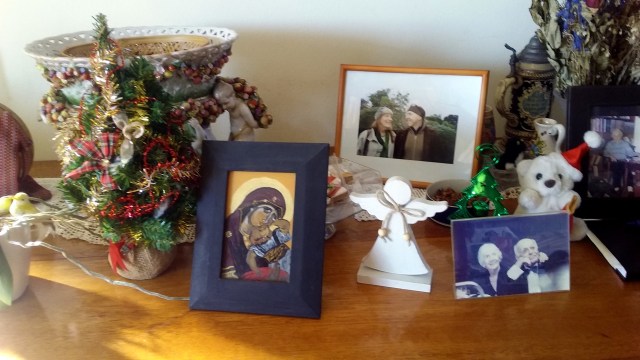 When you are of mixed ethnicity, you are blessed to celebrate Christmas twice. My table is ready for the second celebration with an icon I had painted on glass in reverse a few years ago. Some of my loved ones will be with us in spirit.
