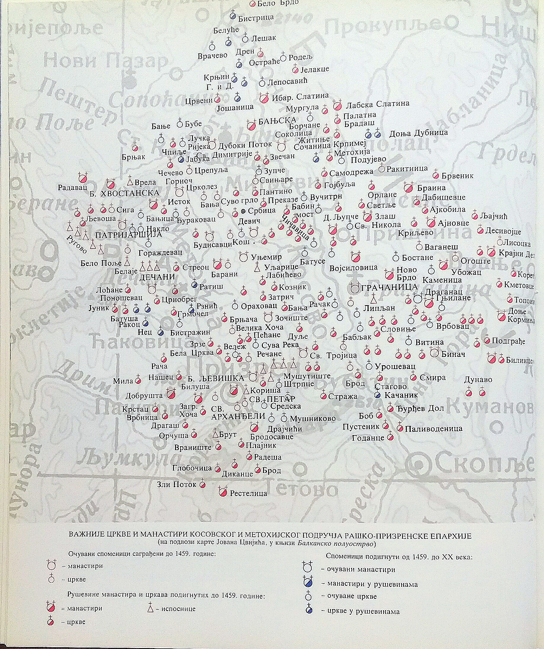 From the book “Endowments in Kosovo” – This map shows the more important churches and monasteries in the “land of monasteries”, built from the 13th to the 20th century. Those marked red and blue are in ruins, destroyed mainly by the Ottomans. Many more, not shown on this map, have been destroyed or damaged in recent history during the Kosovo war.