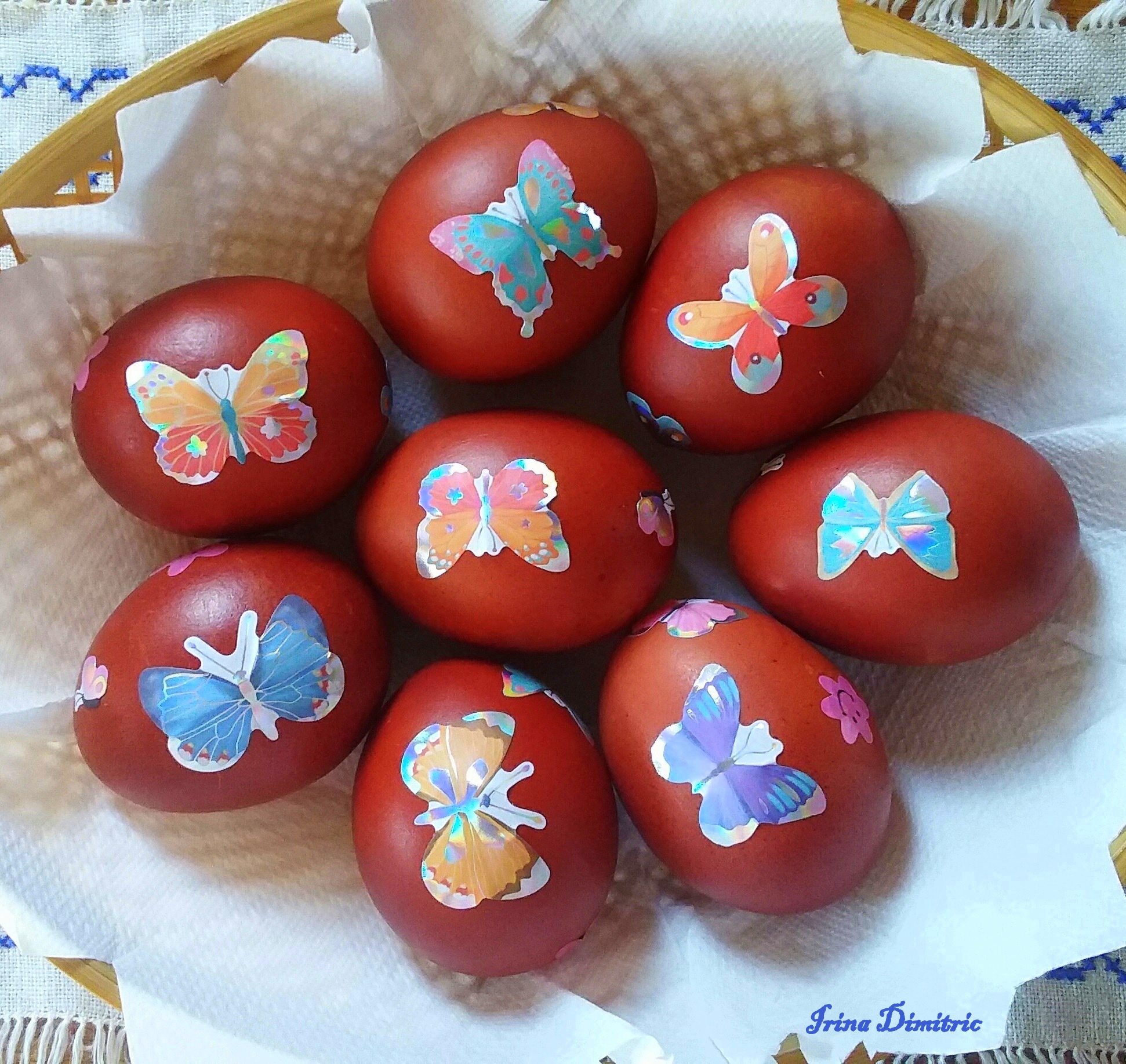 Onion-dyed Easter eggs – Flowers would have been more appropriate according to custom, but I couldn’t find any nice stickers. I rather like these pretty butterflies, appropriate symbols of a new and happy life. Anyway, I’m ready for the egg-cracking contest! 🙂