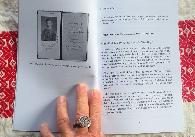On 28 June, St. Vitus Day – Vidovdan, 1914, Gavrilo Princip assassinated the heir to the Hapsburg throne and his wife in Sarajevo; exactly a month later Austria-Hungary declared war on Serbia and attacked Belgrade the following day. My father’s young life was thrown into turmoil by World War One, and I was privileged to hear those stories from his own mouth. By writing this book I wanted to pay tribute not only to my father, but also to all the brave men and women of the Great War, some of whom feature in the book.